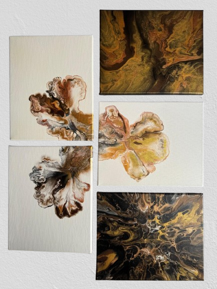 Esta seria de cinco cuadros, titulada «Orquídeas», combina los fondos blanco y negro, adornados con trazos en oro metálico que capturan la delicadeza del brillo de una orquídea en contraste creando un juego de luz y sombra que aporta elegancia e serenidad. Ideal para espacios refinados como sala de estar o dormitorio.